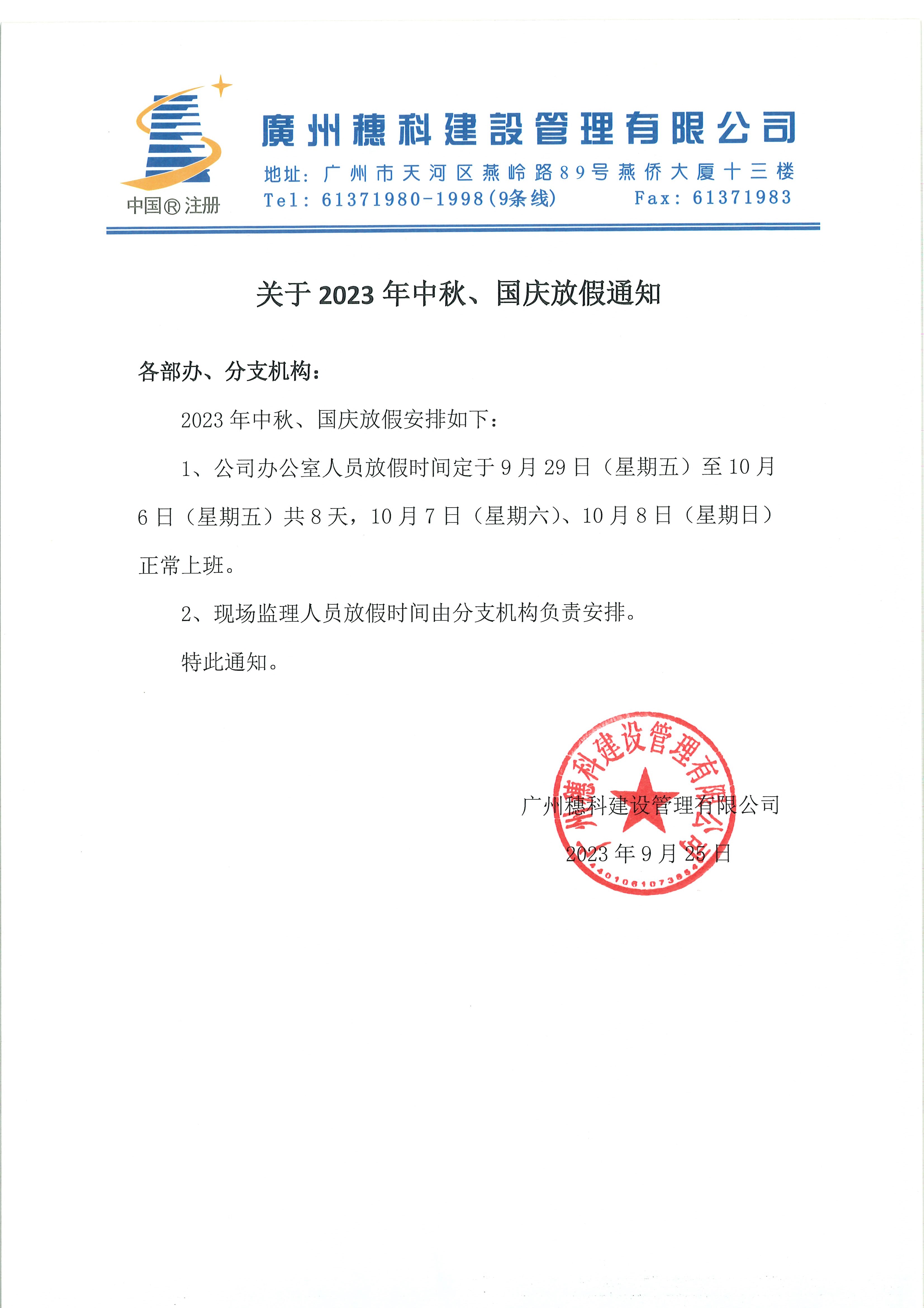 關(guān)于2023年中秋、國慶放假通知